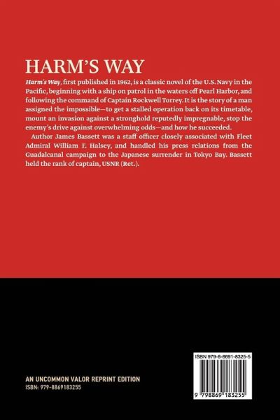 Harm's Way, first published in 1962, is a classic novel of the U.S. Navy in the Pacific during World War II, beginning with a ship on patrol in the waters off Pearl Harbor, and then following the men and ships as they engage the enemy in a time of war. From the dust-jacket: "Framed by the open weather door of his cabin, where he stood peering through the obscure dawn toward Oahu's invisible shoreline, Captain Rockwell Torrey, USN, was not unlike the ship he commanded: tall, spare, angular, and plainly fabricated out of the same hard gray substance that armored both man and cruiser against the weapons of a hostile world. To his Naval Academy classmates, to the men he commanded, to the woman he loved, this man was known as "The Rock." If he possessed any human weaknesses, they were hidden behind a granite facade, unsuspected by subordinates and superiors alike. Yet Rockwell Torrey was a human being, a mere man as well as a fearless leader, beset by doubts, haunted by memory, forced into decision, confronted with fantastic challenges. In spite of - or because of - his humanity, he was first and foremost a commander. Harm's Way is the story of this command, of the war in the Pacific as viewed from the fighting bridge, through the eyes of one officer. It is the story of a man assigned the impossible - to get a stalled operation back on its timetable, mount an invasion against a stronghold reputedly impregnable, stop the enemy's drive against overwhelming odds-and how he succeeded." Author James Bassett was a staff officer closely associated with Fleet Admiral William F. Halsey, and handled his press relations from the Guadalcanal campaign to the Japanese surrender in Tokyo Bay. Bassett held the rank of captain, USNR (Ret.). The novel was the basis for the 1965 Otto Preminger movie In Harm's Way, starring John Wayne and Kirk Douglas.