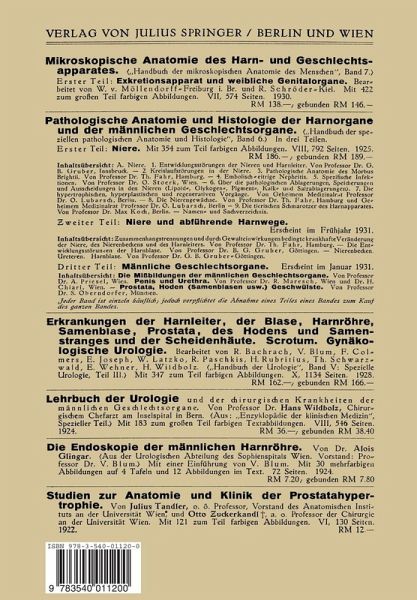 I. Einführung.- II. Allgemeine Übersicht.- III. Der Hoden (Testis).- A. Die Entwicklung.- B. Der Hoden des Erwachsenen.- C. Der Hoden des Greises.- D. Das Hodennetz und der Bindegewebskörper (Rete testis, Mediastinum testis).- IV. Der Nebenhoden (Epididymis).- A. Die Entwicklung.- B. Der Nebenhoden des Erwachsenen.- V. Die Anhänge des Hodens und des Nebenhodens (Appendices testis et epididymidis).- A. Der Hodenanhang (Appendix testis).- B. Der Nebenhodenanhang (Appendix epididymidis).- C. Die Anhänge des Hodennetzes (Appendices rete testis).- D. Der Beihoden (Paradidymis).- E. Die abirrenden Nebenhodengänge (Ductuli aberrantes).- F. Die serösen Hodenbläschen (Vesiculae serosae tunicae albugineae).- VI. Der Samenleiter und die Bläschendrüse (Ductus deferens, Glandula vesiculosa).- A. Die Entwicklung.- B. Der Samenleiter (Ductus deferens).- C. Die Bläschendrüse (Glandula vesiculosa).- VII. Die Harnröhre (Urethra virilis).- A. Die Einteilung.- B. Die Form der einzelnen Abschnitte und ihrer Falten.- C. Der Feinbau der Schleimhaut.- D. Zusammenfassung der Befunde über die Harnröhrenschleimhaut.- VIII. Die Vorsteherdrüse (Prostata).- A. Die Entwicklung.- B. Die Vorsteherdrüse des Erwachsenen.- C. Die Vorsteherdrüse des Greises.- D. Der Utriculus prostaticus.- IX. Die Bulbourethraldrüse (Glandula bulbourethralis).- X. Die Paraurethraldrüsen (Glandulae paraurethrales).- XI. Die paraurethralen Gänge (Ductuli paraurethrales).- XII. Die Rute (Penis, Membrum virile).- A. Die Entwicklung.- B. Die Rute des Erwachsenen.- C. Die Rute des Greises.- XIII. Der Samenstrang (Funiculus spermaticus).- A. Der Inhalt.- B. Die Hüllen.- XIV. Die Hodenhüllen.- A. Die inneren Hüllen.- B. Die Haut des Hodensackes.- Namenverzeichnis.
