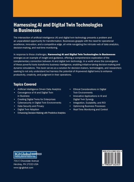 The intersection of artificial intelligence (AI) and digital twin technology presents a problem and an unparalleled opportunity for transformation. Businesses grapple with the need for operational excellence, innovation, and a competitive edge, all while navigating the intricate web of data analytics, decision-making, and real-time monitoring. In response to these challenges, Harnessing AI and Digital Twin Technologies in Businesses emerges as an example of insight and guidance, offering a comprehensive exploration of the complementary connection between AI and digital twin technology. In a world where the convergence of these powerful tools transforms business intelligence, enabling initiative-taking decision-making and dynamic simulations. This book serves as a solution for decision-makers, technologists, and researchers seeking to not only understand but harness the potential of AI-powered digital twins to enhance productivity, creativity, and judgment in their operations.