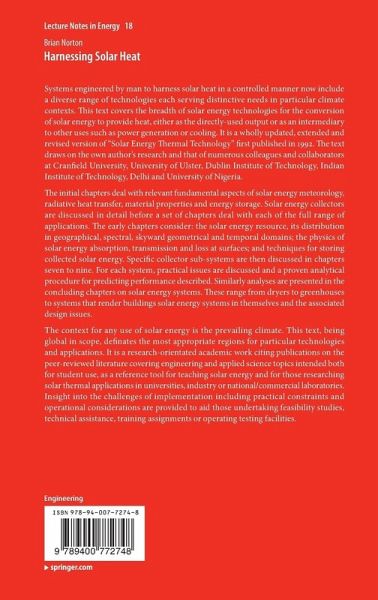 Systems engineered by man to harness solar heat in a controlled manner now include a diverse range of technologies each serving distinctive needs in particular climate contexts. This text covers the breadth of solar energy technologies for the conversion of solar energy to provide heat, either as the directly-used output or as an intermediary to other uses such as power generation or cooling. It is a wholly updated, extended and revised version of "Solar Energy Thermal Technology" first published in 1992. The text draws on the own author's research and that of numerous colleagues and collaborators at Cranfield University, University of Ulster, Dublin Institute of Technology, Indian Institute of Technology, Delhi and University of Nigeria.
