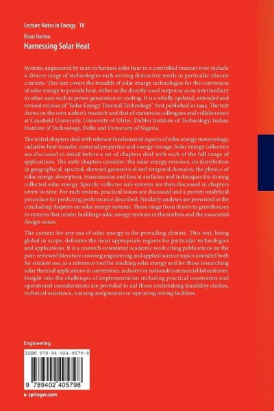 Systems engineered by man to harness solar heat in a controlled manner now include a diverse range of technologies each serving distinctive needs in particular climate contexts. This text covers the breadth of solar energy technologies for the conversion of solar energy to provide heat, either as the directly-used output or as an intermediary to other uses such as power generation or cooling. It is a wholly updated, extended and revised version of "Solar Energy Thermal Technology" first published in 1992. The text draws on the own author's research and that of numerous colleagues and collaborators at Cranfield University, University of Ulster, Dublin Institute of Technology, Indian Institute of Technology, Delhi and University of Nigeria.