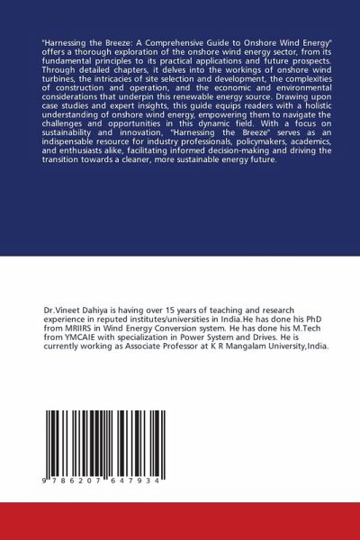 "Harnessing the Breeze: A Comprehensive Guide to Onshore Wind Energy" offers a thorough exploration of the onshore wind energy sector, from its fundamental principles to its practical applications and future prospects. Through detailed chapters, it delves into the workings of onshore wind turbines, the intricacies of site selection and development, the complexities of construction and operation, and the economic and environmental considerations that underpin this renewable energy source. Drawing upon case studies and expert insights, this guide equips readers with a holistic understanding of onshore wind energy, empowering them to navigate the challenges and opportunities in this dynamic field. With a focus on sustainability and innovation, "Harnessing the Breeze" serves as an indispensable resource for industry professionals, policymakers, academics, and enthusiasts alike, facilitating informed decision-making and driving the transition towards a cleaner, more sustainable energyfuture.