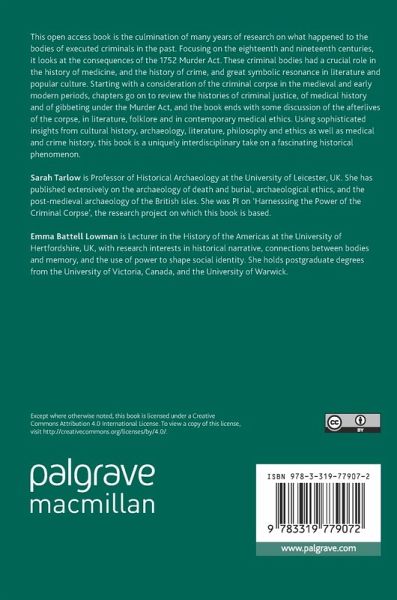 This open access book is the culmination of many years of research on what happened to the bodies of executed criminals in the past. Focusing on the eighteenth and nineteenth centuries, it looks at the consequences of the 1752 Murder Act. These criminal bodies had a crucial role in the history of medicine, and the history of crime, and great symbolic resonance in literature and popular culture. Starting with a consideration of the criminal corpse in the medieval and early modern periods, chapters go on to review the histories of criminal justice, of medical history and of gibbeting under the Murder Act, and ends with some discussion of the afterlives of the corpse, in literature, folklore and in contemporary medical ethics. Using sophisticated insights from cultural history, archaeology, literature, philosophy and ethics as well as medical and crime history, this book is a uniquely interdisciplinary take on a fascinating historical phenomenon.