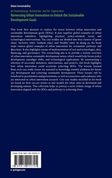 This book first attempts to explore the nexus between urban innovation and sustainable development goals (SDGs). It puts together global examples of urban innovation initiatives, highlighting practical, policy-oriented, social, and technological interventions. The case studies are divided into four clusters of 'green cities', 'inclusive cities', 'resilient cities', and 'healthy cities'. In doing so, the book maps various global examples of urban innovation for sustainable pathways and directions. It also highlights means of implementation of tool and technologies, data, financing, and governance. The overarching aim is to provide a holistic overview of urban innovation sustainable development nexus, which would help future policy development, paradigm shifts, and technological applications.By summarising a selection of successful initiatives, interventions, and projects, this book highlights how urban innovation could accelerate achieving SDGs. The lessons learned from each case studycluster are narrated as knowledge transfer platforms for future city development and achieving sustainable development. These lessons will be beneficial to practitioners and governments, as well as researchers and academics who are interested in urban innovation research. City case studies included in the book are based on their success stories as role models for other cities in developed and developing nations. This collection helps us portray a more holistic image of urban innovation aligned with the SDGs and pathways to achieving them.