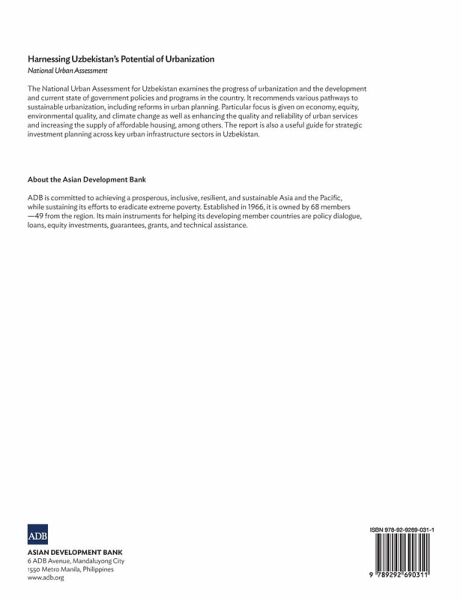 The National Urban Assessment for Uzbekistan examines the progress of urbanization and the current state of government policies and programs in the country. It recommends a shift toward sustainable urbanization and reforms in urban planning. In terms of sustainable urbanization, particular focus is given on economy, equity, environmental quality, and climate change as well as enhancing the quality and reliability of urban services and increasing the supply of affordable housing, among others. The report is also a useful guide for strategic investment planning across key urban infrastructure sectors in Uzbekistan.