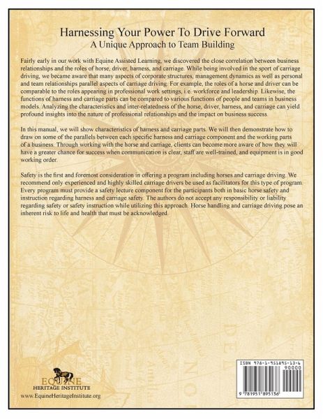 Fairly early in our work with Equine Assisted Learning, we discovered the close correlation between business relationships and the roles of horse, driver, harness, and carriage. While being involved in the sport of carriage driving, we became aware that many aspects of corporate structures, management dynamics as well as personal and team relationships parallel aspects of carriage driving. For example, the roles of a horse and driver can be comparable to the roles appearing in professional work settings, i.e. workforce and leadership. Likewise, the functions of harness and carriage parts can be compared to various functions of people and teams in business models. Analyzing the characteristics and inter-relatedness of the horse, driver, harness, and carriage can yield profound insights into the nature of professional relationships and the impact on business success. In this manual, we will show characteristics of harness and carriage parts. We will then demonstrate how to draw on some of the parallels between each specific harness and carriage component and the working parts of a business. Through working with the horse and carriage, clients can become more aware of how they will have a greater chance for success when communication is clear, staff are well-trained, and equipment is in good working order.