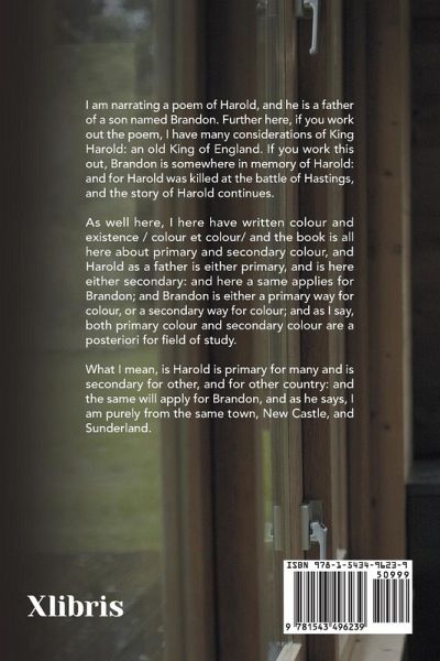 I am narrating a poem of Harold, and he is a father of a son named Brandon. Further here, if you work out the poem, I have many considerations of King Harold: an old King of England. If you work this out, Brandon is somewhere in memory of Harold: and for Harold was killed at the battle of Hastings, and the story of Harold continues. As well here, I here have written colour and existence / colour et colour/ and the book is all here about primary and secondary colour, and Harold as a father is either primary, and is here either secondary: and here a same applies for Brandon; and Brandon is either a primary way for colour, or a secondary way for colour; and as I say, both primary colour and secondary colour are a posteriori for field of study. What I mean, is Harold is primary for many and is secondary for other, and for other country: and the same will apply for Brandon, and as he says, I am purely from the same town, New Castle, and Sunderland.