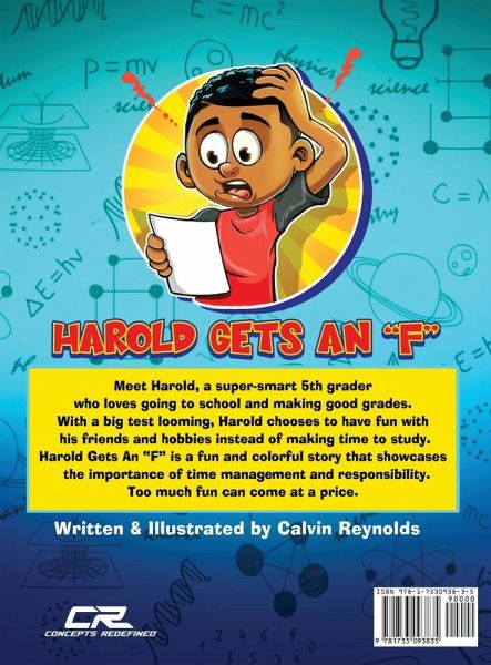 Harold is a super-smart 5th grader who loves going to school and making good grades. With a big test looming, Harold chooses to have fun with his friends and hobbies instead of studying and preparing. Harold Gets An "F" is a fun and colorful story that showcases the importance of responsibility. Too much fun can come at a price.