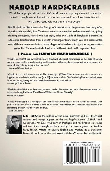 Harold Hardscrabble, by G. D. Dess, is a sympathetic novel filled with philosophical musings on the state of society and our place within it.* The story captures the feelings of frustration and helplessness that many of us experience in our daily lives. These sentiments are embodied in the contemplative, quietly charming protagonist, Harold, who, like Walter Mitty, lives largely in his own world of thoughts and dreams. We follow Harold’s transformation from a dreamer to a man of action as he struggles to discover how to live a meaningful life in a materialistic world. Harold copes admirably with the many disasters and injustices that assail him on his life’s journey; but when he is finally overcome by circumstances beyond his control, he is forced to take matters into his own hands to attain justice for the all the misfortunes he has been made to suffer. This is a story of a quest for self-realization that unfolds slowly as it builds to its ineluctable, explosive climax. "Crisply literary and reminiscent of The Secret Life of Walter Mittyin tone and circumstance, the happenstance and sweet resilience of [Harold] are what anchors Dess's winning fable and make it every bit as entrancing, quirky, sad, and darkly humorous from start to finish." —BookLife Prize in Fiction "Harold Hardscrabble is a thoughtful and well-written observation of the human condition. Dess pushes members of the modern world to question many things and consider that maybe even something unlikely could come to be true." —Red City Review "Harold Hardscrabble" is a sympathetic novel filled with philosophical musings on the state of society and our place within it, on balancing intellectualism with everyday success, and on overcoming the sense of simply being a cog in the machine. —Foreward Clarion Reviews "Harold Hardscrabble" is a sympathetic novel filled with philosophical musings on the state of society and our place within it, on balancing intellectualism with everyday success, and on overcoming the sense of simply being a cog in the machine. —Foreward Clarion Reviews "Harold Hardscrabble is smartly written, informed by the philosophies and ideas of various documents and writers, including Karl Marx, David Foster Wallace and Noam Chomsky." —Blue Ink Review "Harold Hardscrabble is an excellent, philosophical tale that explores the life of a brilliant, troubled man and his ups and downs. The existential crises that haunt the titular character make him sympathetic and worth rooting for. The story bobs and weaves but never fails to hold the attention of the reader. A fine read." —Manhattan Book Review