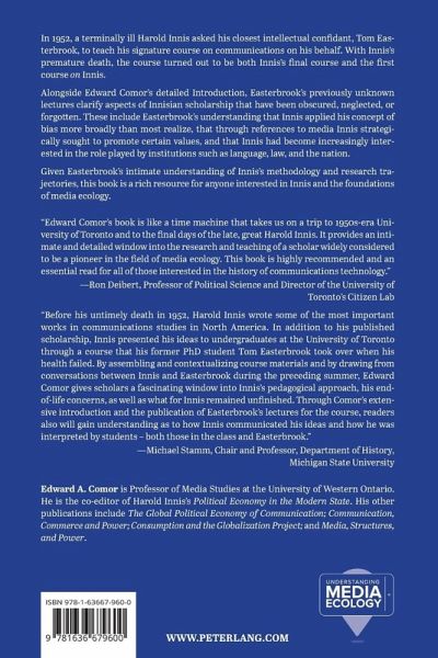 In 1952, a terminally ill Harold Innis asked his closest intellectual confidant, Tom Easterbrook, to teach his signature course on communications on his behalf. With Innis's premature death, the course turned out to be both Innis's final course and the first course on Innis. Alongside Edward Comor's detailed Introduction, Easterbrook's previously unknown lectures clarify aspects of Innisian scholarship that have been obscured, neglected, or forgotten. These include Easterbrook's understanding that Innis applied his concept of bias more broadly than most realize, that through references to media Innis strategically sought to promote certain values, and that Innis had become increasingly interested in the role played by institutions such as language, law, and the nation. Given Easterbrook's intimate understanding of Innis's methodology and research trajectories, this book is a rich resource for anyone interested in Innis and the foundations of media ecology. "Edward Comor's book is like a time machine that takes us on a trip to 1950s-era University of Toronto and to the final days of the late, great Harold Innis. It provides an intimate and detailed window into the research and teaching of a scholar widely considered to be a pioneer in the field of media ecology. This book is highly recommended and an essential read for all of those interested in the history of communications technology." -Ron Deibert, Professor of Political Science and Director of the University of Toronto's Citizen Lab "Before his untimely death in 1952, Harold Innis wrote some of the most important works in communications studies in North America. In addition to his published scholarship, Innis presented his ideas to undergraduates at the University of Toronto through a course that his former PhD student Tom Easterbrook took over when his health failed. By assembling and contextualizing course materials and by drawing from conversations between Innis and Easterbrook during the preceding summer, Edward Comor gives scholars a fascinating window into Innis's pedagogical approach, his end-of-life concerns, as well as what for Innis remained unfinished. Through Comor's extensive introduction and the publication of Easterbrook's lectures for the course, readers also will gain understanding as to how Innis communicated his ideas and how he was interpreted by students - both those in the class and Easterbrook." -Michael Stamm, Chair and Professor, Department of History, Michigan State University