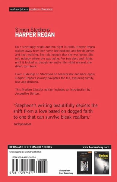 If you go, I don't think you should come back. On a startlingly bright autumn night in 2006, Harper Regan walked away from her home, her husband and daughter, and kept walking. She told nobody that she was going. She told nobody where she was going. She put everything she ever built at risk. For two lost days and nights, until it looked as though her entire life might unravel, she didn't turn back. From Uxbridge to Stockport to Manchester and back again, Harper Regan navigates the UK, exploring family, love and delusion. It received its world premiere at the National Theatre, London, in 2008.