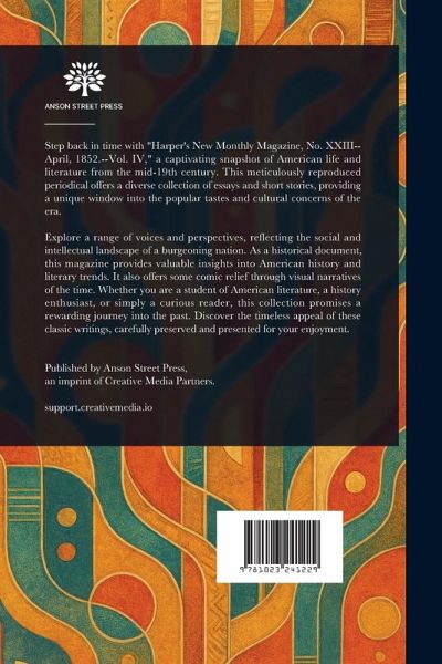 Step back in time with "Harper's New Monthly Magazine, No. XXIII--April, 1852.--Vol. IV," a captivating snapshot of American life and literature from the mid-19th century. This meticulously reproduced periodical offers a diverse collection of essays and short stories, providing a unique window into the popular tastes and cultural concerns of the era. Explore a range of voices and perspectives, reflecting the social and intellectual landscape of a burgeoning nation. As a historical document, this magazine provides valuable insights into American history and literary trends. It also offers some comic relief through visual narratives of the time. Whether you are a student of American literature, a history enthusiast, or simply a curious reader, this collection promises a rewarding journey into the past. Discover the timeless appeal of these classic writings, carefully preserved and presented for your enjoyment. This work has been selected by scholars as being culturally important, and is part of the knowledge base of civilization as we know it. This work is in the public domain in the United States of America, and possibly other nations. Within the United States, you may freely copy and distribute this work, as no entity (individual or corporate) has a copyright on the body of the work. Scholars believe, and we concur, that this work is important enough to be preserved, reproduced, and made generally available to the public. We appreciate your support of the preservation process, and thank you for being an important part of keeping this knowledge alive and relevant.