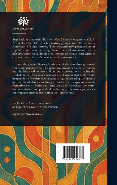 Step back in time with "Harper's New Monthly Magazine, Vol. I., No. 5, October 1850," a fascinating glimpse into 19th-century American life and letters. This meticulously prepared print republication preserves a significant piece of American literary history, offering a diverse collection of essays and articles characteristic of the era's popular monthly magazines. Explore the general literary landscape of the time through varied voices and perspectives. This periodical provides a unique window into the historical context and cultural conversations shaping the United States. Delve into a rich tapestry of writing that captured the imagination of readers over a century ago, showcasing the breadth and depth of American thought and artistic expression in its formative years. Perfect for enthusiasts of American literature, historical studies, and periodical publications, this volume promises a captivating journey to the heart of the 19th century. This work has been selected by scholars as being culturally important, and is part of the knowledge base of civilization as we know it. This work is in the public domain in the United States of America, and possibly other nations. Within the United States, you may freely copy and distribute this work, as no entity (individual or corporate) has a copyright on the body of the work. Scholars believe, and we concur, that this work is important enough to be preserved, reproduced, and made generally available to the public. We appreciate your support of the preservation process, and thank you for being an important part of keeping this knowledge alive and relevant.