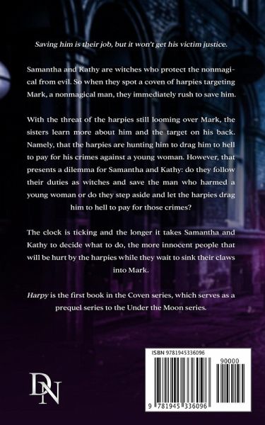Saving him is their job, but it won't get his victim justice. Samantha and Kathy are witches who protect the nonmagical from evil. So when they spot a coven of harpies targeting Mark, a nonmagical man, they immediately rush to save him. With the threat of the harpies still looming over Mark, the sisters learn more about him and the target on his back. Namely, that the harpies are hunting him to drag him to hell to pay for his crimes against a young woman. However, that presents a dilemma for Samantha and Kathy: do they follow their duties as witches and save the man who harmed a young woman or do they step aside and let the harpies drag him to hell to pay for those crimes? The clock is ticking and the longer it takes Samantha and Kathy to decide what to do, the more innocent people that will be hurt by the harpies while they wait to sink their claws into Mark. Harpy is the first book in the Coven series, which serves as a prequel series to the Under the Moon series.