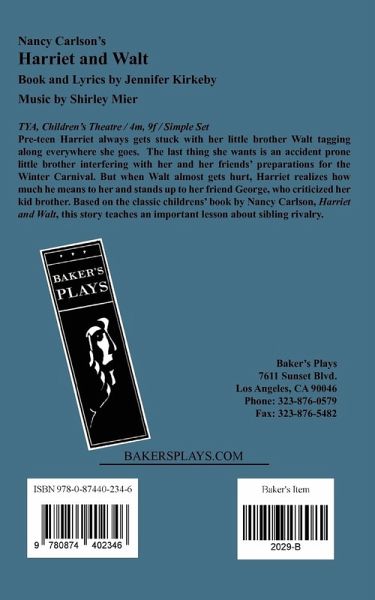 TYA, Children's Theatre / Characters: 4m, 9f / Simple Set Pre-teen Harriet always gets stuck with her little brother Walt tagging along everywhere she goes. The last thing she wants is an accident prone little brother interferingrnwith her and her friends' preparations for the Winter Carnival. When Walt almost gets hurt, Harriet realizes how much he means to her and stands up to her friend George, who criticized her kid brother. Based on the classic childrens' book by Nancy Carlson, Harriet and Walt, this story teaches an important lesson about sibling rivalry.
