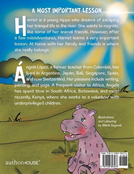 Harriet is a young hippo who dreams of escaping her tranquil life in the river. She wants to migrate, like some of her animal friends. However, after a few misadventures, Harriet learns a very important lesson: At home with her family and friends is where she really belongs.