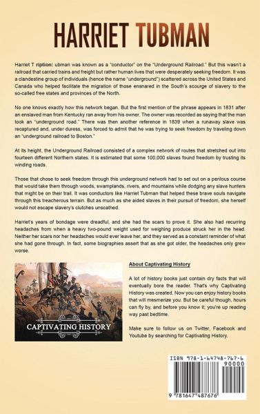 If you want to discover the captivating life of Harriet Tubman, then keep reading... Harriet Tubman was known as a "conductor" on the "Underground Railroad." But this wasn't a railroad that carried trains and freight but rather human lives that were desperately seeking freedom. It was a clandestine group of individuals (hence the name "underground") scattered across the United States and Canada who helped facilitate the migration of those ensnared in the South's scourge of slavery to the so-called free states and provinces of the North. Harriet's years of bondage were dreadful, and she had the scars to prove it. She also had recurring headaches from when a heavy two-pound weight used for weighing produce struck her in the head. Neither her scars nor her headaches would ever leave her, and they served as a constant reminder of what she had gone through. In fact, some biographies assert that as she got older, the headaches only grew worse. But Harriet was a fighter. And she insisted on those around her having that same fighting spirit as well. Her steely determination was forged on the Underground Railroad, where to turn back meant slavery, severe punishment, and possibly death. Harriet Tubman traveled up and down the backroads in the dead of night, with only her own wits and her faith in God to help her. In Harriet Tubman: A Captivating Guide to an American Abolitionist Who Became the Most Famous Conductor of the Underground Railroad, you will discover topics such asNever Again Harriet's Vision Begins to Take Shape Harriet Makes a Break for Freedom First Forays on the Underground Railroad General Tubman Takes Charge Harriet on the Front Lines With the Help of Her Family and Friends Preparing a Place for Harriet Tubman And much, much more! So if you want to learn more about the captivating life of Harriet Tubman, scroll up and click the "add to cart" button!