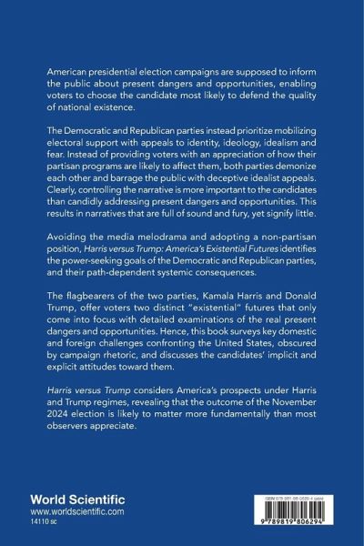 American presidential election campaigns are supposed to inform the public about present dangers and opportunities, enabling voters to choose the candidate most likely to defend the quality of national existence. The Democratic and Republican parties instead prioritize mobilizing electoral support with appeals to identity, ideology, idealism and fear. Instead of providing voters with an appreciation of how their partisan programs are likely to affect them, both parties demonize each other and barrage the public with deceptive idealist appeals. Clearly, controlling the narrative is more important to the candidates than candidly addressing present dangers and opportunities. This results in narratives that are full of sound and fury, yet signify little. Avoiding the media melodrama and adopting a non-partisan position, Harris versus Trump: America's Existential Futures identifies the power-seeking goals of the Democratic and Republican parties, and their path-dependent systemic consequences. The flagbearers of the two parties, Kamala Harris and Donald Trump, offer voters two distinct "existential" futures that only come into focus with detailed examinations of the real present dangers and opportunities. Hence, this book surveys key domestic and foreign challenges confronting the United States, obscured by campaign rhetoric, and discusses the candidates' implicit and explicit attitudes toward them. Harris versus Trump considers America's prospects under Harris and Trump regimes, revealing that the outcome of the November 2024 election is likely to matter more fundamentally than most observers appreciate.