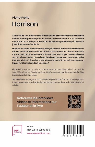 À la mort de son meilleur ami, Mirsad Bukvic est confronté à une situation inédite d'héritage impliquant les fameux réseaux sociaux. Il va parcourir une partie du monde pour tenter de résoudre un problème qu'il ressent à juste titre comme insoluble. Mi polar mi conte philosophique, petit jeu pervers entre clause testamentaire et manipulation familiale, réflexion discrète sur les réseaux sociaux ? Il y a un peu de tout cela dans Harrison. Quel est l'impact de ces réseaux sur nos vies actuelles ? Des règles familiales ancestrales pourraient-elles être leur victime ? Que dire si par-dessus le marché nos animaux domestiques font les frais de tout ce cirque ?