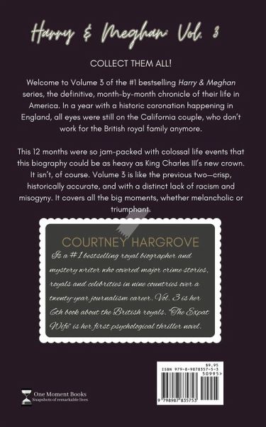 Welcome to Volume 3 of the #1 bestselling Harry & Meghan series, the definitive, month-by-month historical record of their life in America. In a year with a historic coronation happening in England, all eyes were still on the California couple, who don't work for the British royal family anymore. The third year of the Duke and Duchess of Sussex living outside the confines of the royal family was so jam-packed with colossal life events that this biography could be as heavy as King Charles III's new crown.It isn't, of course. Volume 3 is like the other two-crisp, historically accurate, and with a distinct lack of racism and misogyny. It covers all the big moments, whether melancholic or triumphant: The death of Harry's grandmother, the longest-reigning monarch in British history, Queen Elizabeth II; the ascension of his father to the throne, culminating with the coronation of King Charles III; the Sussex children officially given Prince and Princess titles they actually (cough) had at birth; Harry's weighty memoir; Meghan's award-winning podcast; the Netflix special-oh my! This isn't all that happened during these 12 months, as royal watchers know all too well. Grab a cup of tea or a glass of wine, a crisp Dubonnet and gin or a mug of hot cocoa, and crack open the third book in this snappy biography series that chronicles a year in the life of Harry and Meghan, the Duke and Duchess of Sussex. As with the previous two volumes, readers will gain new insight from author Courtney Hargrove's unique perspective as a reporter who's covered royals in her career and knows how the media machine operates.