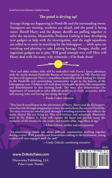 The pond is drying up! Strange things are happening in Pondville and the surrounding towns. Youngsters are missing, residents are afraid, and the pond is losing water. Sheriff Harry and the deputy sheriffs are pulling together to solve the mysteries. Meanwhile, Professor Ludwig is busy developing new gadgets to help with the investigation, and the eagle squadrons are called in to assist in searching for the kidnappers ... while spies are watching and plotting to take Ludwig hostage. Danger, thrills, and ingenious gadgets are at play. Will good triumph over evil? How will Harry deal with the nasty, wily criminals-if he finds them?