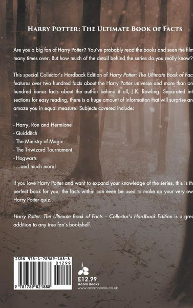 Are you a big fan of Harry Potter? You’ve probably read the books and seen the films many times over. But how much of the detail behind the series do you really know? This Special Collector’s Hardback Edition of Harry Potter: The Ultimate Book of Facts features over two hundred facts about the Harry Potter universe and more than one hundred bonus facts about the author behind it all, J.K. Rowling. Separated into sections for easy reading, there is a huge amount of information that will surprise and amaze you in equal measure! Subjects covered include: Harry, Ron and Hermione Quidditch The Ministry of Magic The Triwizard Tournament Hogwarts ...and much more! If you love Harry Potter and want to expand your knowledge of the series, this is the perfect book for you; the facts within can even be used to make up your very own Harry Potter quiz. Harry Potter: The Ultimate Book of Facts – Special Collector’s Edition is a great addition to any true fan’s bookshelf.