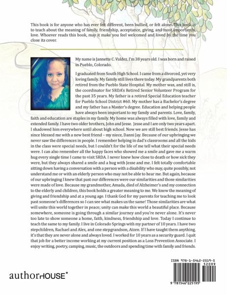 My name is Jannette C. Valdez. Im 38 years old. I was born and raised in Pueblo, Colorado. I graduated from South High School. I came from a divorced, yet very loving family. My family still lives there today. My grandparents both retired from the Pueblo State Hospital. My mother was, and still is, the coordinator for SRDAs Retired Senior Volunteer Program for the past 35 years. My father is a retired Special Education teacher for Pueblo School District #60. My mother has a Bachelors degree and my father has a Masters degree. Education and helping people have always been important to my family and parents. Love, family, faith and education are staples in my family. My home was always filled with love, family and extended family. I have two older brothers, John and Jesse. Jesse and I are only two years apart. I shadowed him everywhere until about high school. Now we are still best friends. Jesse has since blessed me with a new best friend my niece, Danni Jay. Because of our upbringing we never saw the differences in people. I remember helping in dads classrooms and all the kids in the class were special needs, but I couldnt for the life of me tell what their special needs were. I can also remember all the happy faces who showed me a smile and gave me a warm hug every single time I came to visit SRDA. I never knew how close to death or how sick they were, but they always shared a smile and a hug with Jesse and me. I felt totally comfortable sitting down having a conversation with a person with a disability who may, quite possibly, not understand me or with an elderly person who may not be able to hear me. But again, because of our upbringing I knew that past our differences were our similarities and those similarities were made of love. Because my grandmother, Amada, died of Alzheimers and my connection to the elderly and children, this book holds a greater meaning to me. We knew the meaning of giving and friendship and at a young age. I thank God for my parents for teaching me to look past someones differences so I can see what makes us the same! Those similarities are what will unite this world together in peace; unity can make this world a beautiful place. Because somewhere, someone is going through a similar journey and youre never alone. Its never too late to show someone a home, faith, kindness, friendship and love. Today I continue to teach the same to my family. I live in Colorado Springs with my partner of 10 years. I have two stepchildren, Rachael and Alex, and one stepgrandson, Aizen. If I have taught them anything, its that they are never alone and always loved. I worked for 10 years as a security guard. I quit that job for a better income working at my current position as a Loss Prevention Associate. I enjoy writing, poetry, camping, music, the outdoors and spending time with family and friends.