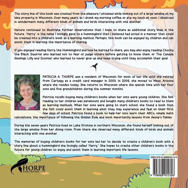 The story line of this book was created from the pleasure I attained while looking out of a large window at my lake property in Wisconsin. Over many years, as I drank my morning coffee or ate my lunch at noon, I observed in wonderment many different kinds of animals and birds interacting with one another. Nature continued to illustrate further observations that I hope to share as additional story lines in the future. "Harry" is the name I lovingly gave to a hummingbird that I believed had acted in a manner that could be created into a children's book as a learning method. Perhaps, this book can be enjoyed by children and can assist them in learning the importance of sharing. If you enjoyed reading Harry the Hummingbird and how he learned to share, you may also enjoy reading Chucky the Black Squirrel who learned not to fear or judge others before getting to know them, or The Canada Goslings Lilly and Scooter who learned to never give up and keep trying until they accomplish their goal. Patricia A. Thorpe was a resident of Wisconsin for most of her life until she retired from Certegy as a credit card manager in 2003. In 2006, she moved to Mesa, Arizona where she resides today. She returns to Wisconsin where she spends time with her four sons and five grandchildren during the summer months. Patricia recalls buying many children's books when her sons were young children. She felt reading to her children was paramount and bought many children's books to read to them as learning methods. When her sons were going to start school, she found a book that she felt could assist them in learning what they may experience and feel on their first few days of school. Patricia found a book to help her sons learn their ABCs, simple math calculations, the importance of following the Golden Rule and most importantly lessons from Aesop's Fables. During the seven years Patricia lived on Lake Kristine in northern Wisconsin, she found herself looking out of the large window from her dining room. From there she observed many different kinds of birds and animals interacting with one another. The memories of buying children's books for her sons led her to decide to create a children's book with a story line about a hummingbird she lovingly called "Harry." She hopes to create other children's books in the future for young children to enjoy and assist them in learning important life lessons.