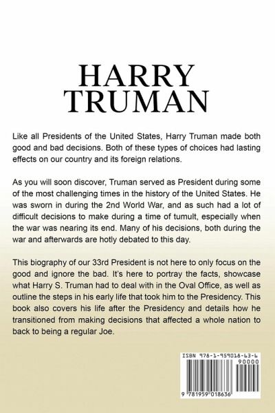 HARRY TRUMAN Like all Presidents of the United States, Harry Truman made both good and bad decisions. Both of these types of choices had lasting effects on our country and its foreign relations. As you will soon discover, Truman served as President during some of the most challenging times in the history of the United States. He was sworn in during the 2nd World War, and as such had a lot of difficult decisions to make during a time of tumult, especially when the war was nearing its end. Many of his decisions, both during the war and afterwards are hotly debated to this day. This biography of our 33rd President is not here to only focus on the good and ignore the bad. It's here to portray the facts, showcase what Harry S. Truman had to deal with in the Oval Office, as well as outline the steps in his early life that took him to the Presidency. This book also covers his life after the Presidency and details how he transitioned from making decisions that affected a whole nation to back to being a regular Joe.