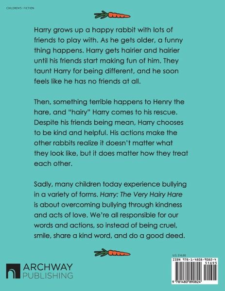 Harry grows up a happy rabbit with lots of friends to play with. As he gets older, a funny thing happens. Harry gets hairier and hairier until his friends start making fun of him. They taunt Harry for being different, and he soon feels like he has no friends at all. Then, something terrible happens to Henry the hare, and "hairy" Harry comes to his rescue. Despite his friends being mean, Harry chooses to be kind and helpful. His actions make the other rabbits realize it doesn't matter what they look like, but it does matter how they treat each other. Sadly, many children today experience bullying in a variety of forms. Harry: The Very Hairy Hare is about overcoming bullying through kindness and acts of love. We're all responsible for our words and actions, so instead of being cruel, smile, share a kind word, and do a good deed.