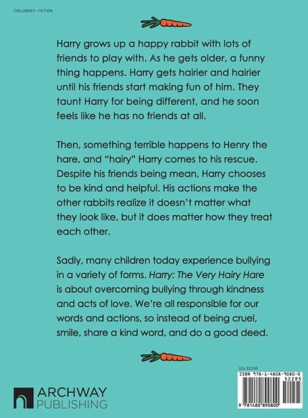 Harry grows up a happy rabbit with lots of friends to play with. As he gets older, a funny thing happens. Harry gets hairier and hairier until his friends start making fun of him. They taunt Harry for being different, and he soon feels like he has no friends at all. Then, something terrible happens to Henry the hare, and "hairy" Harry comes to his rescue. Despite his friends being mean, Harry chooses to be kind and helpful. His actions make the other rabbits realize it doesn't matter what they look like, but it does matter how they treat each other. Sadly, many children today experience bullying in a variety of forms. Harry: The Very Hairy Hare is about overcoming bullying through kindness and acts of love. We're all responsible for our words and actions, so instead of being cruel, smile, share a kind word, and do a good deed.