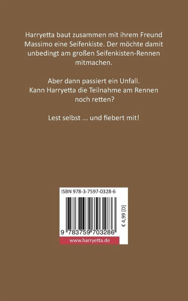 Harryetta baut zusammen mit ihrem Freund Massimo eine Seifenkiste. Der möchte damit unbedingt am großen Seifenkisten-Rennen mitmachen. Aber dann passiert ein Unfall.Kann Harryetta die Teilnahme am Rennen noch retten? Lest selbst ... und fiebert mit!