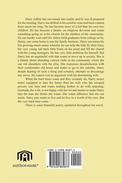 Harry Jobber has run smack into reality and he was ill prepared for the meeting. Harry has drifted in his comfort zone and been content there much too long. He has become more of a kid than his own two children. He has become a fanatic on religious devotion and wants something going on at his church for the children of the community. He can hardly wait until his oldest child graduates from college so he, Henry, can come home to run the family business. Harry envisions his life growing much easier whereby he can help the kids fly their kites, the very young sail their little boats on his pond and fill the church with the young teenagers. He has very little ambition for himself. But Harry has an ungrateful wife that wants to move up in society. She is a fanatic about attending various clubs in the community where she can rub shoulders with the elite. She expresses dissatisfaction with their comfortable old home and wants to go to the suburbs. Harry dreads hearing of such a thing and certainly attempts to discourage any move. He cannot win an argument with his dominating wife. When the hard times come and they certainly do, Harry seems better equipped to face the future than his wife who has escaped poverty one time and wants nothing further to do with returning. Gertrude, the wife, is not happy with her lot and strains to make Harry into the man she thinks she wants. She wants affluence that she can touch. Harry just wants to live and let live in a world of his own. But the very hard time come. There is some beautiful poetry sprinkled throughout the novel.
