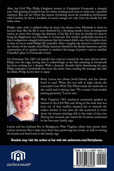 After the Civil War, Philip Creighton returns to Creighton's Crossroads a changed man. Still grieving Caroline's loss, he wishes nothing more than to settle into a peaceful existence. But can he? Given the rumors circulating about his scandalous involvement with Caroline, he faces a backlash of moral outrage not only from his family but the entire town. Philip's other wish is realized when he learns his divorce from Elizabeth is about to become final. But his life is soon shattered by a shocking murder from an unexpected source, an event that changes the direction of his life. It is then he decides it's time to bring his illegitimate son Chandler to Crossroads. His family's predictable reaction to this is indignation mingled with jealousy that his bastard child is now the Creighton heir, so they set out to make Philip's life miserable. After a lengthy trip abroad to recover from the trauma of the murder trial, Philip immerses himself in the family businesses and the construction of an opulent mansion to reinforce his image of power-and to establish Chandler's place in Crossroads society. On Christmas Eve 1867, his family's last cruel act toward his two year old son drives Philip over the edge, forcing him to acknowledge at last that returning to Crossroads has been nothing but a disaster. With a dramatic flourish before abandoning his past, Philip unleashes a bombshell that stuns the entire town, sending the message that, like his father, Philip knows how to repay.