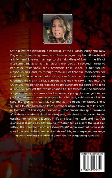 Set against the picturesque backdrop of the Hudson Valley and New England, this touching narrative embarks on a journey from the ashes of a failed and loveless marriage to the rekindling of love in the life of fifty-something Savannah. Embracing the roles of a devoted mother to her three remarkable sons, Savannah finds solace in her familial responsibilities, and it's through these duties that she rediscovers her true self. An unexpected twist of fate, born from an ordinary visit to her cherished ice cream parlor, compels Savannah to take a leap into the unknown. Armed with her cell phone, she summons the courage to send a Facebook request that would change her life forever. As the emotions surge within her, she savors her ice cream, slipping the change into her pocket, and heads home to prepare for a birthday celebration with her sons and their families. That evening, as she opens her laptop, she is stunned to read a message from a stranger named Drew Hart. It is here, in the heart of this digital connection, that Savannah's spirit awakens after three decades of slumber. Overjoyed, she thanks the unseen forces guiding her newfound journey in life and love. Their swift and heartfelt exchanges lead to a heartwarming invitation for ice cream the next day, setting the stage for months of shared 'firsts' and a love that promises to stand the test of time. Yet, as the tale unfolds, an unexpected message appears, casting a shadow of doubt on the burgeoning romance.