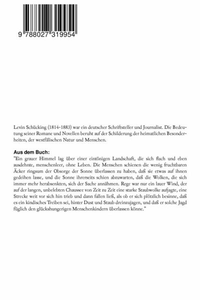 Levin Schücking (1814-1883) war ein deutscher Schriftsteller und Journalist. Die Bedeutung seiner Romane und Novellen beruht auf der Schilderung der heimatlichen Besonderheiten, der westfälischen Natur und Menschen. Aus dem Buch: "Ein grauer Himmel lag über einer eintönigen Landschaft, die sich flach und eben ausdehnte, menschenleer, ohne Leben. Die Menschen schienen die wenig fruchtbaren Äcker ringsum der Obsorge der Sonne überlassen zu haben, daß sie etwas auf ihnen gedeihen lasse, und die Sonne ihrerseits schien abzuwarten, daß die Wolken, die sich immer mehr herabsenkten, sich der Sache annähmen. Rege war nur ein lauer Wind, der auf der langen, unbelebten Chaussee von Zeit zu Zeit eine starke Staubwolke aufjagte, eine Strecke weit vor sich hin trieb und dann fallen ließ, als ob er sich plötzlich besinne, daß es ein kindisches Treiben sei, hinter Dust und Staub dreinzujagen, und daß er solche Jagd füglich den glückshungerigen Menschenkindern überlassen könne."