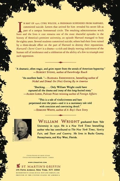 In 2002, a researcher for The Harvard Crimson came across a restricted archive labeled "Secret Court Files, 1920." The mystery he uncovered involved a tragic scandal in which Harvard University secretly put a dozen students on trial for homosexuality and then systematically and persistently tried to ruin their lives. In May of 1920, Cyril Wilcox, a freshman suspended from Harvard, was found sprawled dead on his bed, his room filled with gas--a suicide. The note he left behind revealed his secret life as part of a circle of (cut "young") homosexual students. The resulting witch hunt and the lives it cost remains one of the most shameful episodes in the history of America's premiere university. Supported by legendary Harvard President Lawrence Lowell, Harvard conducted its investigation in secrecy. Several students committed suicide; others had their lives destroyed by an ongoing effort on the part of Harvard to destroy their reputations. Harvard's Secret Court is a deeply moving indictment of the human toll of intolerance and the horrors of injustice that can result when a powerful institution loses its balance.