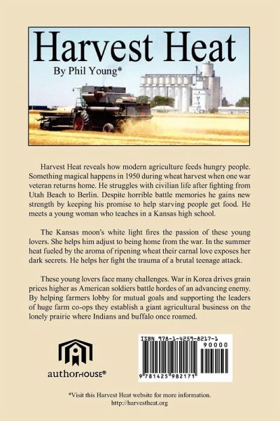 Harvest Heat reveals how modern agriculture feeds hungry people. Something magical happens in 1950 during wheat harvest when one war veteran returns home. He struggles with civilian life after fighting from Utah Beach to Berlin. Despite horrible battle memories he gains new strength by keeping his promise to help starving people get food. He meets a young woman who teaches in a Kansas high school. The Kansas moon's white light fires the passion of these young lovers. She helps him adjust to being home from the war. In the summer heat fueled by the aroma of ripening wheat their carnal love exposes her dark secrets. He helps her fight the trauma of a brutal teenage attack. These young lovers face many challenges. War in Korea drives grain prices higher as American soldiers battle hordes of an advancing enemy. By helping farmers lobby for mutual goals and supporting the leaders of huge farm co-ops they establish a giant agricultural business on the lonely prairie where Indians and buffalo once roamed. With friends from Las Vegas they gamble and gain new wealth by trading grain commodity futures. But only 55 years later one of America's largest farmer-owned cooperatives is bankrupt. Harvest Heat explains the intricate political relationships of people who helped build a multi-billion dollar agribusiness empire. They now struggle to keep their family farms that supply most of America's food. Harvest Heat tells how much of America's political influence comes from citizens in small towns. In the vibrant world of agribusiness these Midwestern folks clash with big corporations and crooked politicians who crave more power and money. Visit this Harvest Heat website for more information. http://harvestheat.org