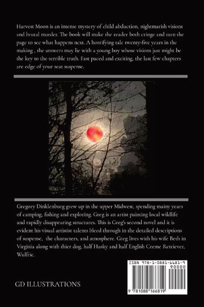 Meet Johnny Romano, a quiet intelligent child of twelve. He's a typical kid with the challenges of making friends and fitting in. The buzzed-cut blonde hair boy with penetrating green-blue eyes fills his days with normal activities, chores around the house and farm, and attending Saint Joseph the Worker parochial school. Between keeping up with his little sister, Mary, and dodging the ever-watchful eyes of the nuns, Johnny's normal boring life takes a dreadful turn. Harvest Moon centers around Johnny Romano who awakes from a terrible dream, the fourth one in as many nights. His dreams feature a 'Shadow-Man', a malevolent creature only the subconscious can conjure, or is it more? Could these dreams be premonitions of events to occur? Johnny is blessed or cursed, depending on how one looks at it, by a special ability first discovered by his grandmother. As the dreams unfold, so do weird occurrences that start to unravel the quiet small community where the Romanos live. After Mary disappears one evening just before the full moon in October 1976, Johnny assists Detective Carson in unraveling a quarter-century mystery of unsolved murders. The novel features the backstories of Johnny's parents, Maddy and Michael Romano, as well as a deep look into 'The Shadow-Man's' psyche.