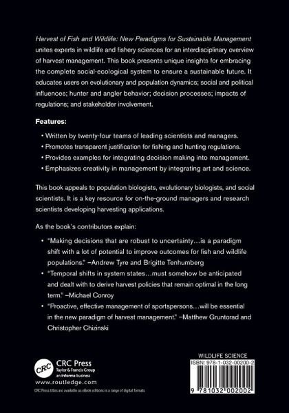 Harvest of Fish and Wildlife: New Paradigms for Sustainable Management unites experts in wildlife and fishery sciences for an interdisciplinary overview of harvest management. This book presents unique insights for embracing the complete social-ecological system to ensure a sustainable future. It educates users on evolutionary and population dynamics; social and political influences; hunter and angler behavior; decision processes; impacts of regulations; and stakeholder involvement. Features: Written by twenty-four teams of leading scientists and managers. Promotes transparent justification…mehr