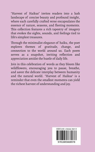 "Harvest of Haikus" invites readers into a lush landscape of concise beauty and profound insight, where each carefully crafted verse encapsulates the essence of nature, seasons, and fleeting moments. This collection features a rich tapestry of imagery that evokes the sights, sounds, and feelings tied to life's simplest treasures. Through the minimalist elegance of haiku, the poet explores themes of gratitude, change, and connection to the world around us. Each poem serves as a snapshot, inviting reflection and appreciation amidst the hustle of daily life. Join in this celebration of words as…mehr