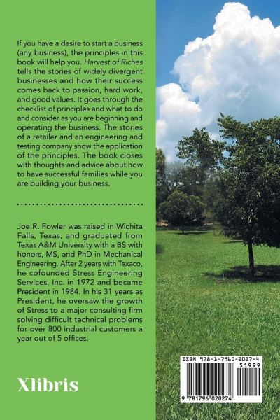 If you have a desire to start a business (any business), the principles in this book will help you. Harvest of Riches tells the stories of widely divergent businesses and how their success comes back to passion, hard work, and good values. It goes through the checklist of principles and what to do and consider as you are beginning and operating the business. The stories of a retailer and an engineering and testing company show the application of the principles. The book closes with thoughts and advices about how to have successful families while you are building your business.