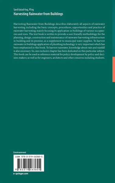The present book describes in detail all aspects of rainwater harvesting, including the basic concepts, procedures, opportunities and practice of rainwater harvesting mainly focusing its application in buildings of various occupancies and sizes. It provides a user-friendly methodology for the planning, design, construction and maintenance of rainwater harvesting infrastructure, in buildings and its premise, as a supplement to conventional water supplies. It highlights the application of plumbing technology, which is an important aspect of rainwater harvesting in buildings. It also includes global rainfall scenario and brief notes on all the elements of rainwater harvesting used in buildings. It is a valuable reference resource for policy and decision-makers, as well as for engineers, architects and students.