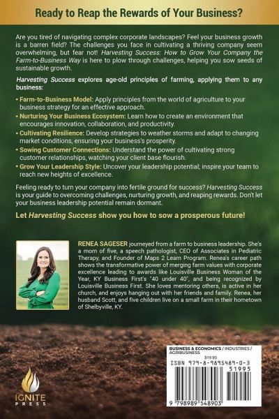 Ready to Reap the Rewards of Your Business? Are you tired of navigating complex corporate landscapes? Feel your business growth is a barren field? The challenges you face in cultivating a thriving company seem overwhelming, but fear not! Harvesting Success: How to Grow Your Company the Farm-to-Business Way is here to plow through challenges, helping you sow seeds of sustainable growth. Harvesting Success explores age-old principles of farming, applying them to any business:Farm-to-Business Model: Apply principles from the world of agriculture to your business strategy for an effective approach. Nurturing Your Business Ecosystem: Learn how to create an environment that encourages innovation, collaboration, and productivity. Cultivating Resilience: Develop strategies to weather storms and adapt to changing market conditions, ensuring your business's prosperity. Sowing Customer Connections: Understand the power of cultivating strong customer relationships, watching your client base flourish. Grow Your Leadership Style: Uncover your leadership potential; inspire your team to reach new heights of excellence. Feeling ready to turn your company into fertile ground for success? Harvesting Success is your guide to overcoming challenges, nurturing growth, and reaping rewards. Don't let your business leadership potential remain dormant. Let Harvesting Success show you how to sow a prosperous future!