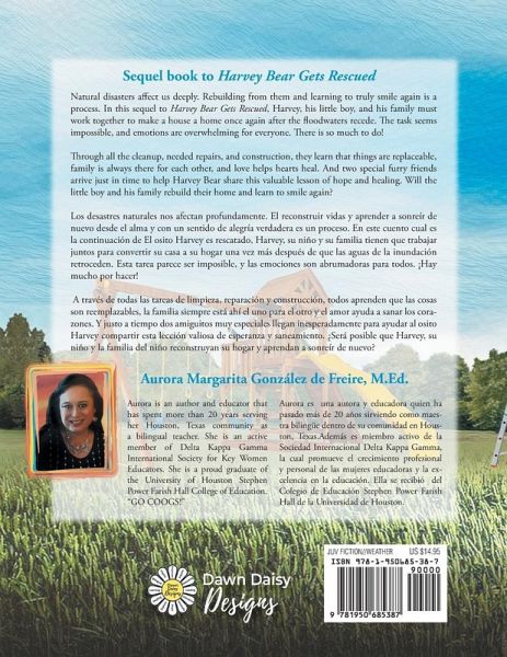 Natural disasters affect us deeply. Rebuilding from them and learning to truly smile again is a process. In this sequel to Harvey Bear Gets Rescued, Harvey, his little boy and his family must work together to make a house a home once again after the floodwaters recede. The task seems impossible, and emotions are overwhelming for everyone. There is so much to do! Through all of the cleanup and repairs and construction, they all learn that things are replaceable, family is always there for each other, and love helps hearts heal. And two special furry friends arrive just in time to help Harvey Bear share this valuable lesson of hope and healing. Will the little boy and his family rebuild their home and learn to smile again? Los desastres naturales nos afectan profundamente. El reconstruir vidas y aprender a sonreír de nuevo desde el alma y con un sentido de alegría verdadera es un proceso. En este cuento cual es la continuación de El osito Harvey es rescatado, Harvey, su niño y su familia tienen que trabajar juntos para convertir su casa a su hogar una vez más después de que las aguas de la inundación retroceden. Esta tarea parece ser imposible, y las emociones son abrumadoras para todos. ¡Hay mucho por hacer! A través de todas las tareas de limpieza, reparación y construcción, todos aprenden que las cosas son reemplazables, la familia siempre está ahí el uno para el otro y el amor ayuda a sanar los corazones. Y justo a tiempo dos amiguitos muy especiales llegan inesperadamente para ayudar al osito Harvey compartir esta lección valiosa de esperanza y saneamiento. ¿Sera posible que Harvey, su niño y la familia del niño reconstruyan su hogar y aprendan a sonreír de nuevo?