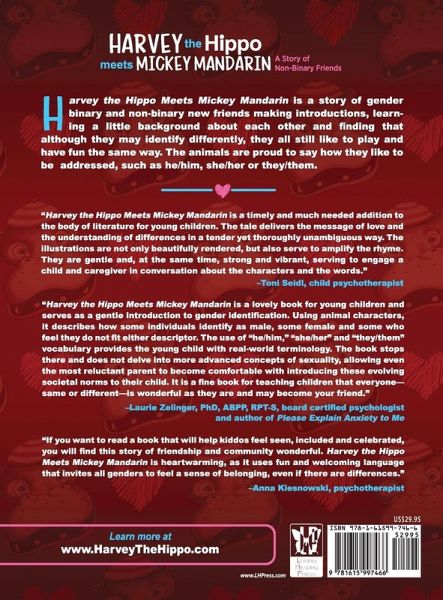 Harvey the Hippo Meets Mickey Mandarin is a story of gender binary and non-binary new friends making introductions, learning a little background about each other and finding that although they may identify differently, they all still like to play and have fun the same way. The animals are proud to say how they like to be addressed, such as he/him, she/her or they/them. "Harvey the Hippo Meets Mickey Mandarin is a timely and much-needed addition to the body of literature for young children. The tale delivers the message of love and the understanding of differences in a tender yet thoroughly unambiguous way. The illustrations are not only beautifully rendered, but also serve to amplify the rhyme. They are gentle and, at the same time, strong and vibrant, serving to engage a child and caregiver in conversation about the characters and the words." -- Toni Seidl, child psychotherapist "Harvey the Hippo Meets Mickey Mandarin is a lovely book for young children and serves as a gentle introduction to gender identification. Using animal characters, it describes how some individuals identify as male, some female and some who feel they do not fit either descriptor. The use of 'he/him,' 'she/her' and 'they/them' vocabulary provides the young child with real-world terminology. The book stops there and does not delve into more advanced concepts of sexuality, allowing even the most reluctant parent to become comfortable with introducing these evolving societal norms to their child. It is a fine book for teaching children that everyone--same or different--is wonderful as they are and may become your friend." -- Laurie Zelinger, PhD, ABPP, RPT-S, board-certified psychologist and author of Please Explain Anxiety to Me "If you want to read a book that will help kiddos feel seen, included and celebrated, you will find this story of friendship and community wonderful. Harvey the Hippo Meets Mickey Mandarin is heartwarming, as it uses fun and welcoming language that invites all genders to feel a sense of belonging, even if there are differences." -- Anna Kiesnowski, psychotherapist