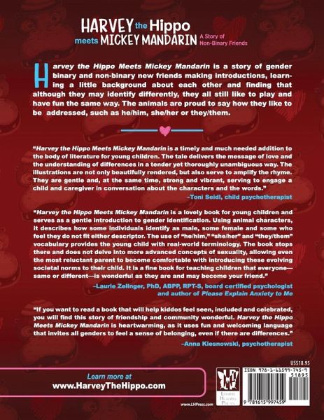 Harvey the Hippo Meets Mickey Mandarin is a story of gender binary and non-binary new friends making introductions, learning a little background about each other and finding that although they may identify differently, they all still like to play and have fun the same way. The animals are proud to say how they like to be addressed, such as he/him, she/her or they/them. "Harvey the Hippo Meets Mickey Mandarin is a timely and much-needed addition to the body of literature for young children. The tale delivers the message of love and the understanding of differences in a tender yet thoroughly unambiguous way. The illustrations are not only beautifully rendered, but also serve to amplify the rhyme. They are gentle and, at the same time, strong and vibrant, serving to engage a child and caregiver in conversation about the characters and the words." -- Toni Seidl, child psychotherapist "Harvey the Hippo Meets Mickey Mandarin is a lovely book for young children and serves as a gentle introduction to gender identification. Using animal characters, it describes how some individuals identify as male, some female and some who feel they do not fit either descriptor. The use of 'he/him,' 'she/her' and 'they/them' vocabulary provides the young child with real-world terminology. The book stops there and does not delve into more advanced concepts of sexuality, allowing even the most reluctant parent to become comfortable with introducing these evolving societal norms to their child. It is a fine book for teaching children that everyone--same or different--is wonderful as they are and may become your friend." -- Laurie Zelinger, PhD, ABPP, RPT-S, board-certified psychologist and author of Please Explain Anxiety to Me "If you want to read a book that will help kiddos feel seen, included and celebrated, you will find this story of friendship and community wonderful. Harvey the Hippo Meets Mickey Mandarin is heartwarming, as it uses fun and welcoming language that invites all genders to feel a sense of belonging, even if there are differences." -- Anna Kiesnowski, psychotherapist