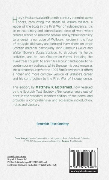 Hary's Wallace is a late fifteenth-century poem in twelve books, recounting the deeds of William Wallace, a leader of the Scots in the First War of Independence. It is an extraordinary and sophisticated piece of work which creates scenes of immense sensual and symbolic intensity to underpin a narrative of Wallace's heroism in the face of struggle, disloyalty and betrayal. Hary draws on other Scottish material, particularly John Barbour's Bruce and Walter Bower's Scotichronicon, to structure his hero's activities, and he uses Chaucerian forms, including the five-stress couplet, to enrich his account and appeal to his contemporary audience. While the poem is best known as the ultimate source for the 1995 film Braveheart, it offers a richer and more complex version of Wallace's career and his contribution to the First War of Independence. This edition, by Matthew P. McDiarmid, now reissued by the Scottish Text Society after several years out of print, is the standard scholarly edition of the poem, and provides a comprehensive and accessible introduction, notes and glossary.