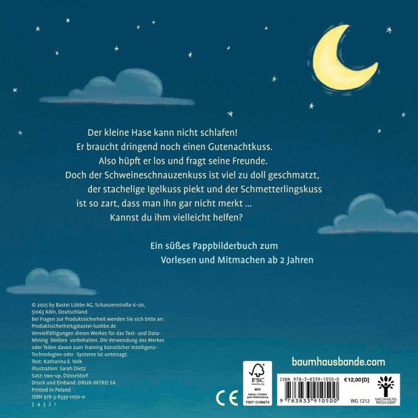 Perfekt für die Einschlafbegleitung: Kuschelig und liebevoll erzählt mit sanften BildernDer kleine Hase kann nicht schlafen! Obwohl seine Mama ihm schon ein Gutenachtküsschen gegeben hat, braucht er dringend noch ein zweites. Und so hüpft er einfach los und fragt seine Freunde. Doch der Schweineschnauzenkuss ist viel zu doll geschmatzt, der stachelige Igelkuss piekt, der Hundeschlabberschleckerkuss kitzelt zu doll, und der Schmetterlingskuss ist so zart, dass man ihn gar nicht merkt. Weit und breit gibt es keinen Gutenachtkuss, der dem kleinen Hasen so richtig gut gefällt. Kannst du ihm vielleicht helfen?- Ein süßes Pappbilderbuch zum Vorlesen und Mitmachen ab 2 Jahren- Mit wiederkehrenden Motiven für ein sanftes Abendritual- Mit wunderschönen und beruhigenden Bildern von Sarah Dietz