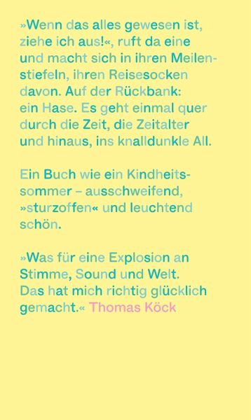 »Wenn das alles gewesen ist, ziehe ich aus!«, ruft da eine und macht sich in ihren Meilenstiefeln, ihren Reisesocken davon. Auf der Rückbank: ein Hase. Es geht einmal quer durch die Zeit, die Zeitalter und hinaus, ins knalldunkle All. Im Strichflieger durch den Himmel und die Erinnerung: an zwei Großmütter, eine helle, eine dunkle, eine heile, eine wunde. Einen Großvater, seine furchigen Hände. Einen Bruder und seinen Baum. An rasende Träume, krumme Märchen und einen Purple Rain.